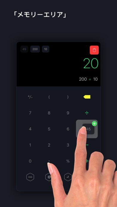 メモリーエリア機能を搭載しています。メモリーエリア内に登録した数値はドラッグするだけで式へと入力可能。桁数が多くて覚えにくい数値などはメモリーエリアに登録しておくことで、素早く式へと利用できます。