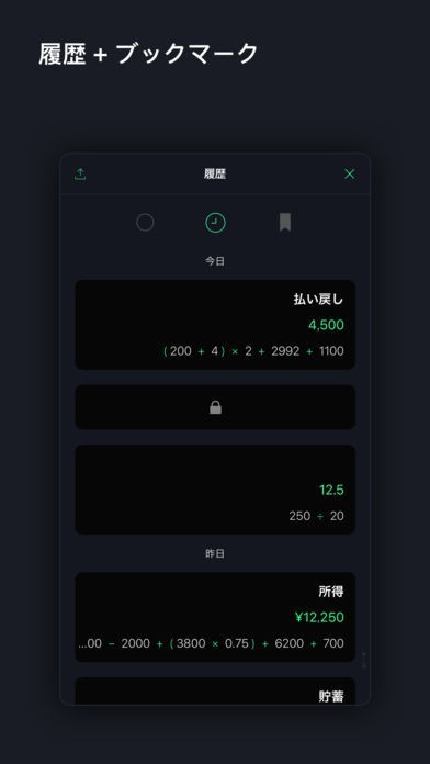 ブックマークを用意しており、登録済みの計算式を手軽に呼び出せます。運賃計算など何度も繰り返し使う計算は、ブックマークに登録しておくことで入力の手間を省き、利便性をアップすることができます。