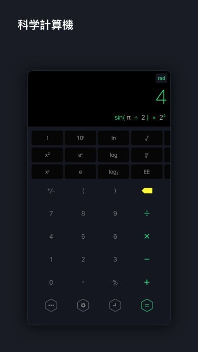 黒に蛍光色の緑が映える画面だけでもカッコいいのに、ドラッグ操作で動かせるのは高度なデバイスを使っているみたいではまってます。()や乗算などを使った関数計算も出来るのは便利です。