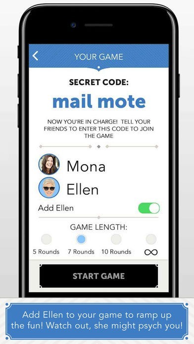 Can you choose the outrageous real answer among your friends’ fakes? Get points for guessing the right answer, and for each other player you PSYCH! into choosing yours. For an extra challenge, add Ellen to your game and try not to get Psyched by her answers!