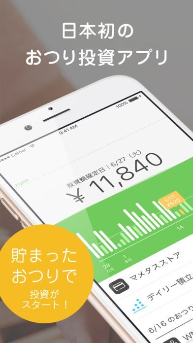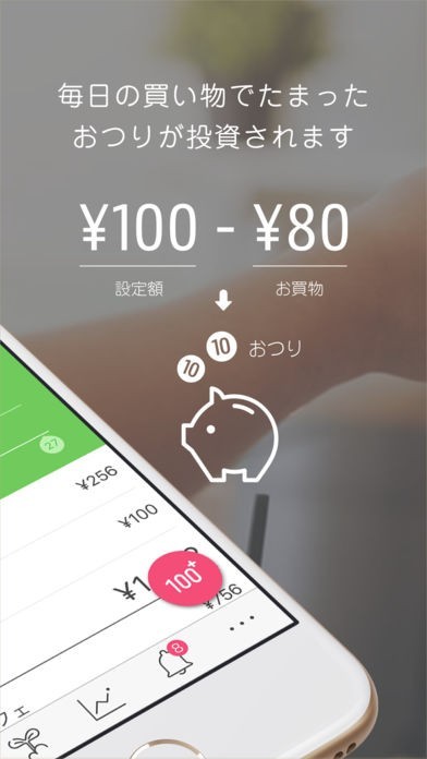 おつりを積み立てて資産運用! おつりの額は100円、500円、1000円の端数から選べる。!