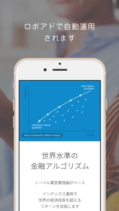 「マメタス - おつりで簡単投資 by WealthNavi」は、 普段の買い物で発生するおつりを積み立て、 そのお金を使って資産運用を行うことができるアプリです。資産運用を行うのは、ロボアドバイザーの「WealthNavi」です。 資産運用アルゴリズムや高度な技術によって適切なポートフォリオを形成し、 一人ひとりの資産運用のサポートを行います。 また、手数料体系も分かりやすく、預かり資産の評価額に対して1%としています。資産運用にあまり詳しくない人やどういった商品に投資すれば分からないという人にぴったりなアプリです。