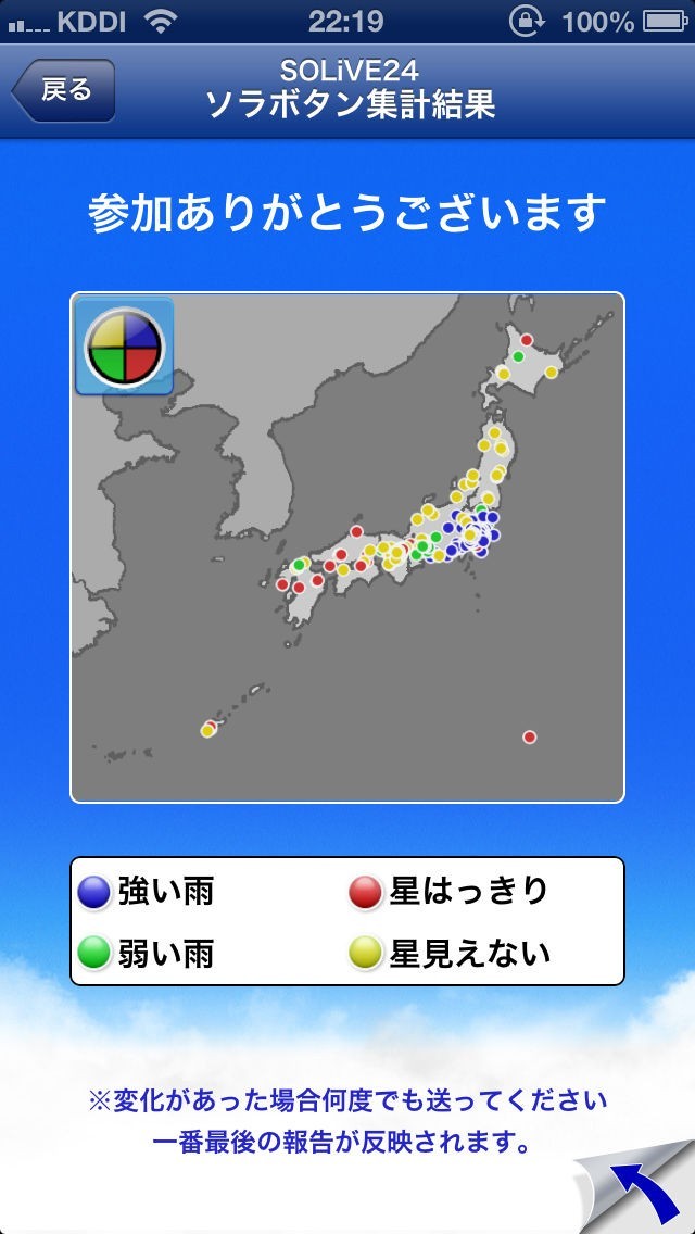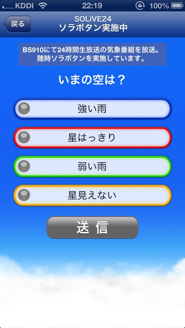 全国のテレビ放送で展開されているお天気コーナーの「みんなでソラをライブ」に参加して、よりきめ細やかなお天気情報を作り上げるためのアプリです。自分のいる位置のお天気情報をその日に出される簡単な選択肢4つの中から選び、答えるだけ。結果はマップで確認できたり、円グラフとなって表示されるので全国の様子がわかります。