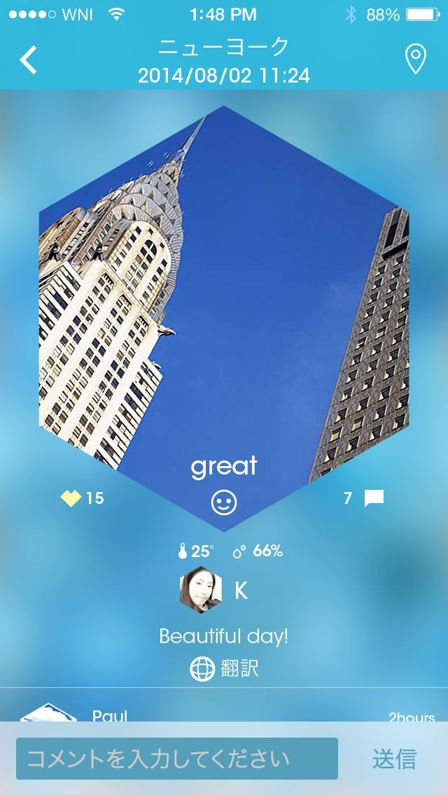 sunnycombとは、世界中の現在での空のデータを把握出来る、ソーシャル形式の天気予報アプリ