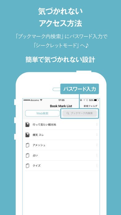 「ウェブピック」を使うことによって、ブックマークを普通に管理する方法と隠して他の方には見れないようにする方法の両方を提供してくれます。 よって知られたくない趣味を持っていたり、重要な情報を取り扱っている場合に役立ちます。 「ブックマーク内検索」という部分は実際にはパスワードの入力場所となっており、特定の文字列を入れると秘密のブックマークが出てきますし、複数のものを同時に管理することが出来ます。 そして、仮にアプリをつけっぱなしにしていた場合には自動で通常のモードに戻ってくれるので見られてしまっても秘密が知られる心配がありませんので、安心することが可能ですし、運営側で情報を取得もしていないので、利用も安心して行えます。