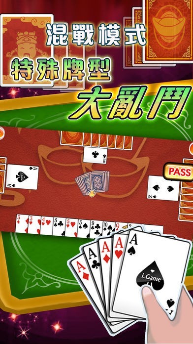 2.[混戰模式]:自兩副牌中隨機出52張,遇到2張大老二可別嚇一跳,牌局中也可能出現「五支」的特殊牌型!