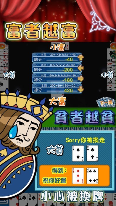 3.[剝削模式]:「富者愈富、貧者愈貧」依玩家每局結束成績而定,富者玩家可在下局換走貧者玩家的好牌。