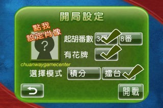 遊戲中遊戲可選擇3番或8番起胡, 打花與否,並特別提供兩種不同玩法,【積分賽】模式,讓你盡情打牌創造高分; 在【擂台賽】模式, 你必須打敗18位不同個性與打牌策略的對手, 才能贏得麻將王冠軍頭銜! 遊戲中還可選擇相簿中的照片作為自己的遊戲圖像!