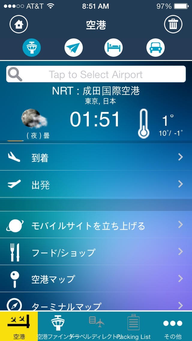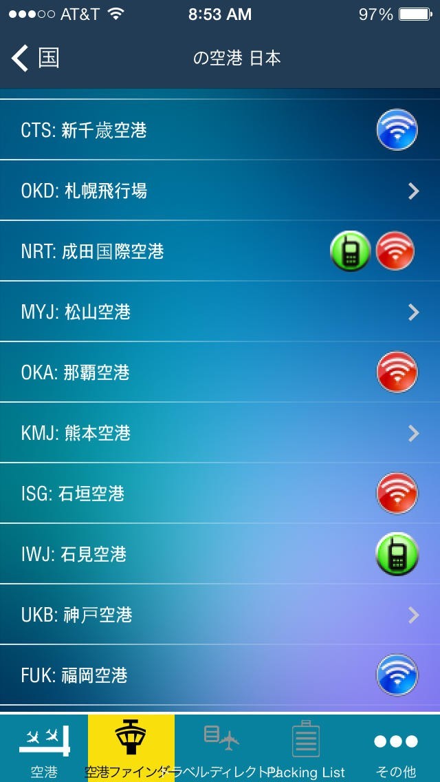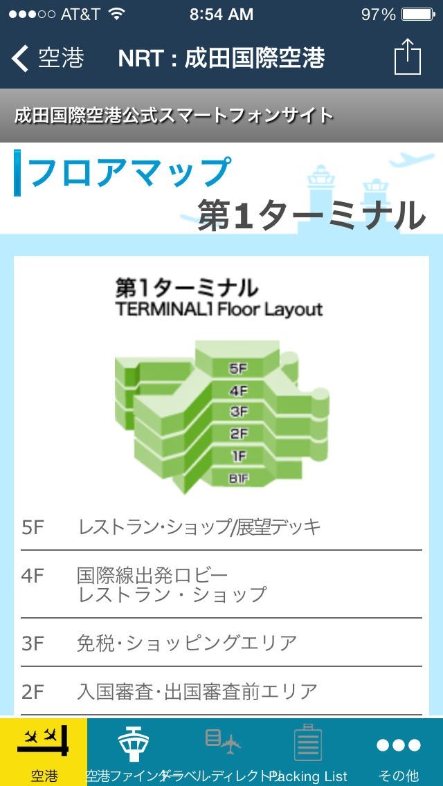 コンプリート駐車場、食料、地図端子、地上交通、無線LANなどを含む各空港の情報、。