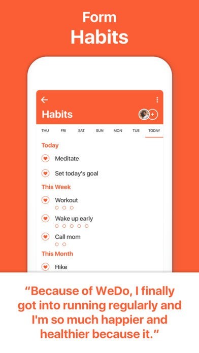 WeDo is the first to help you create and maintain positive habits, alongside everything else you need to remember, whether that be for short or long term goals. Create daily, weekly, and monthly habits, set reminders and view them intuitively on your schedule. We also offer an optional integration with HealthKit to help automate habit tracking!