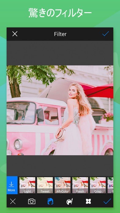 画像のフィルター加工も種類豊富で明るさ調整も自由自在です