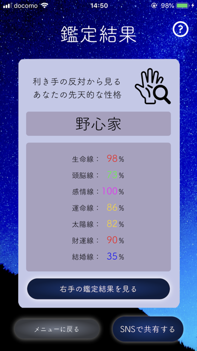 両手の写真が解析し終わったら、手相占いメニューから鑑定結果を見ることができます。