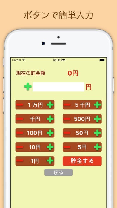 お金の額を入力することで貯金した分としてカウントされていきます。定期的に貯めている場合、用意されている千円、一万円といったボタンで簡単に入力可能で、手間なく貯蓄の継続ができます。