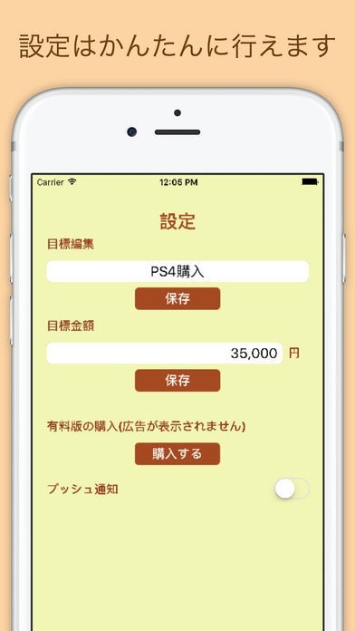欲しい商品や利用したいサービスの名前と金額を設定できます。後どれくらいの貯金が必要なのかがわかるので、モチベーションを維持できる。コツコツ貯蓄をして、憧れの商品をゲットしましょう。