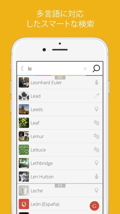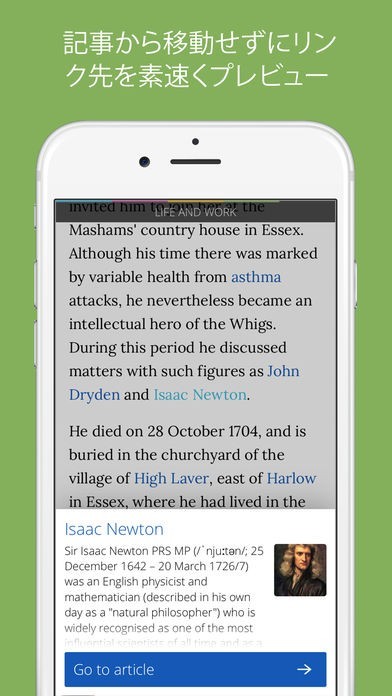 Wikipediaでの調べものを助けてくれるのが「ウィキワンド」というアプリです。多言語検索や記事内のテキスト検索が可能、ページを読んでいる最中に黄色いアイコンをタップ、気になるワードを入力するだけでそのワード部分に素早く移動できます。レポートでの調べものが多い学生にも最適!必要な情報をすぐに見つけることができます。さらには目次表示機能もあり!記事の表示中に右からスワイプ、出てくる目次をタップすれば読みたい項目にすぐに移動できます。また、気になる単語をタップすれば、リンク先ページ内で簡易プレビュー、記事から移動することなく概要を見ることができます。