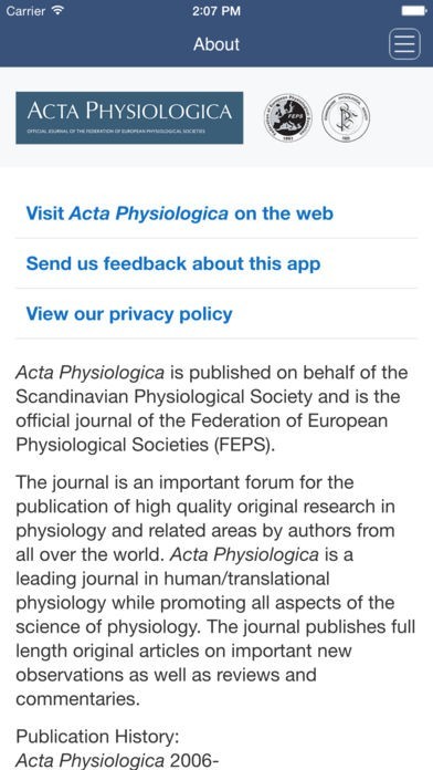 App Storeより引用A leading physiology journal is now available on your iPad and iPhone. Fresh from the Newsstand, Acta Physiologica keeps you up to date with all the latest research, with a strong focus on human/translational physiology while promoting all aspects of the science of physiology. Enjoy an entirely new browsing and reading experience: - Stay current with the latest articles through Early View. - Be notified when a new monthly issue is available. - Download articles and issues for offline perusal. - Save your favourite articles for quick and easy access. - Share articles with colleagues or students.