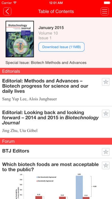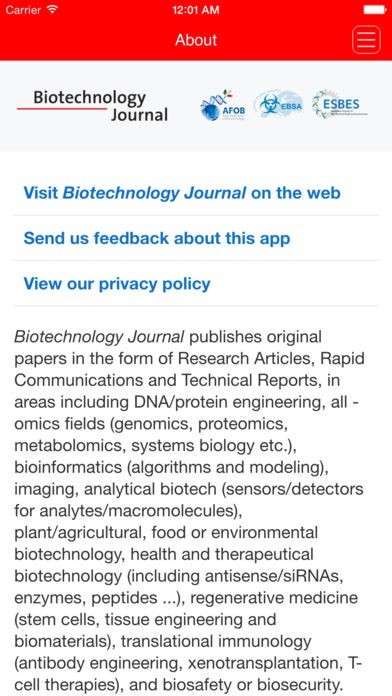 App Storeより引用Biotechnology Journal is the international resource for both biotechnology researchers and professionals in related disciplines. Fully comprehensive in its scope, the journal publishes strictly peer-reviewed papers covering novel aspects and methods in all areas of biotechnology. Special attention is also paid to the public, legal, ethical and cultural aspects of biotechnological research in the Forum section. Most issues are devoted to a special topic, providing the latest comprehensive information on the most crucial areas of research and technological advances.
