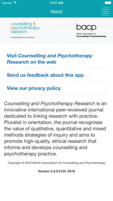 SUBSCRIBE IN THE APP: Annual Subscriptions (4 issues) for the iPad-only edition are available for $159.99 (US) per year. Payment is charged to your iTunes account after confirmation of purchase. Counselling and Psychotherapy Research subscriptions automatically renew within 24 hours of the end of your subscription period for $159.99 (US) unless auto-renew is turned off at least 24 hours before the end of the subscription period. To turn off auto-renew, go to your iTunes account settings after purchase. Note that subscriptions cannot be cancelled during the term of the subscription, but you can still turn off auto-renew to prevent automatic renewal of your subscription. Note that any unused portion of a free trial period, if offered, will be forfeited when you purchases a subscription.