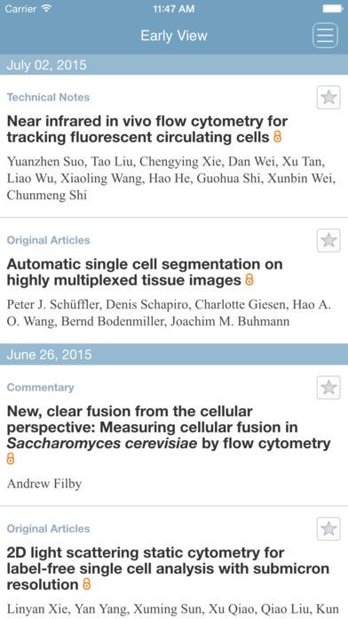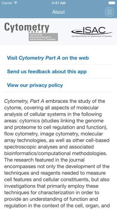 App Storeより引用A leading journal on the study of cytome is now available on your iPad and iPhone. Fresh from the newsstand, “Cytometry Part A” brings you a stimulating, high-impact mixture of Original Research, Review Articles, Commentaries, and more. Enjoy an entirely new browsing and reading experience, and keep up to date with the most important developments in cytome research even faster: