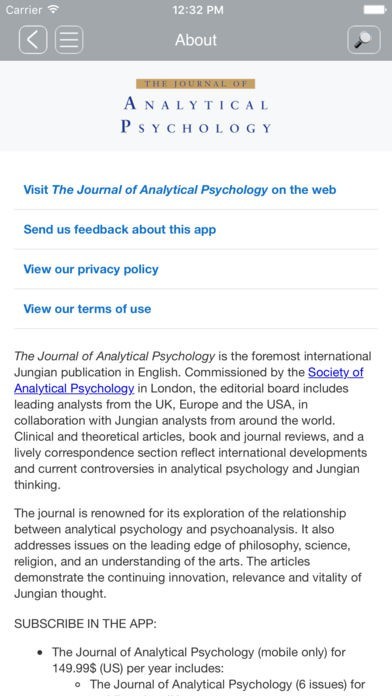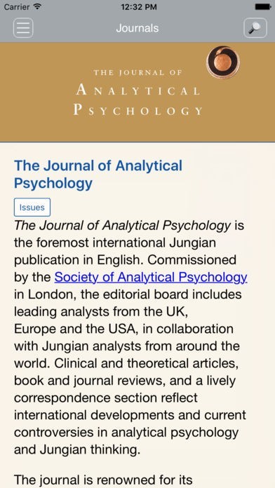 App Storeより引用The Journal of Analytical Psychology is the foremost international Jungian publication in English. Commissioned by the Society of Analytical Psychology in London, the editorial board includes leading analysts from the UK, Europe and the USA, in collaboration with Jungian analysts from around the world. Clinical and theoretical articles, book and journal reviews, and a lively correspondence section reflect international developments and current controversies in analytical psychology and Jungian thinking.