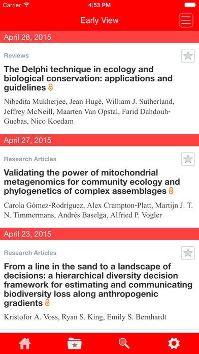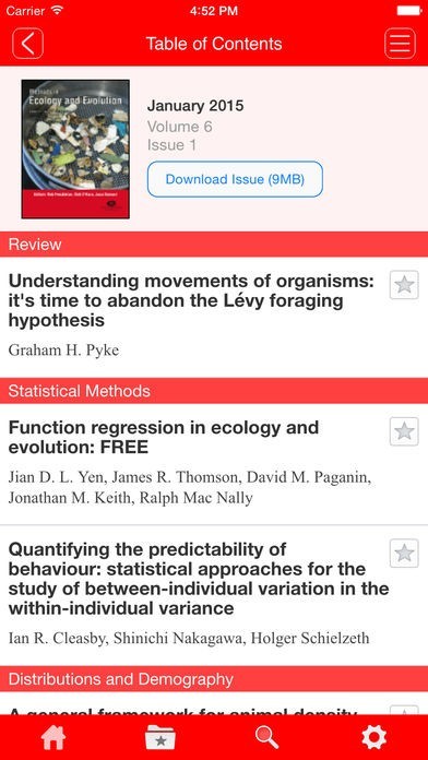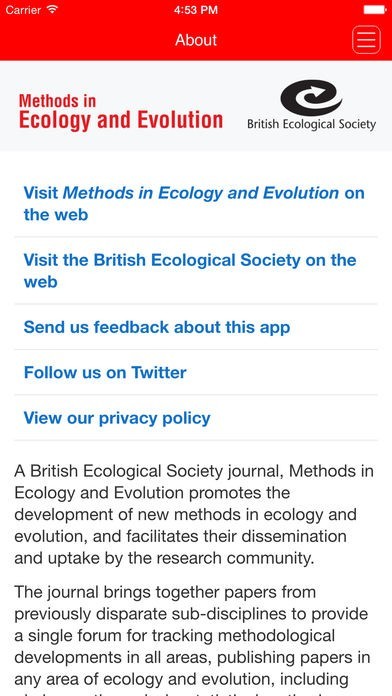 App Storeより引用The Methods in Ecology and Evolution Journal app keeps you up to date with all the latest research in your area of ecological and evolutionary methods. Journal issues can be read in full, giving you all the latest news and research in field, with podcasts and videos giving additional expert insight and opinion. Download the app today to enjoy an entirely new browsing and reading experience, where you can: