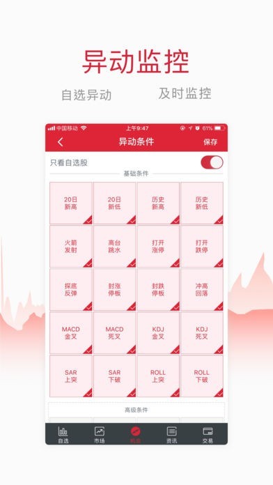 3、智能盯盘:股票盯盘系统、智能预警系统、个股异动提醒、雷达炒股功能、驾车炒股盯盘模式、沙发炒股模式、跑步炒股模式。