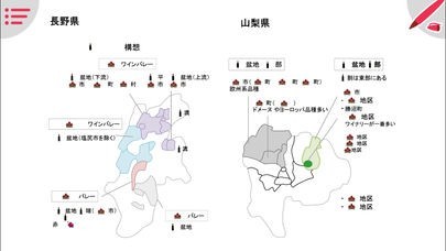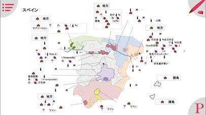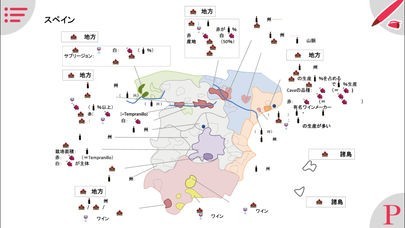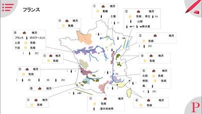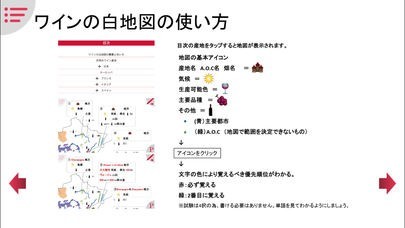 ワインに関する様々な知識が、白地図上に表示されるため、イメージとともに暗記することができます。基礎レベルから上級レベルまで様々な知識が記載されているため、目的に合わせて学習することができます。