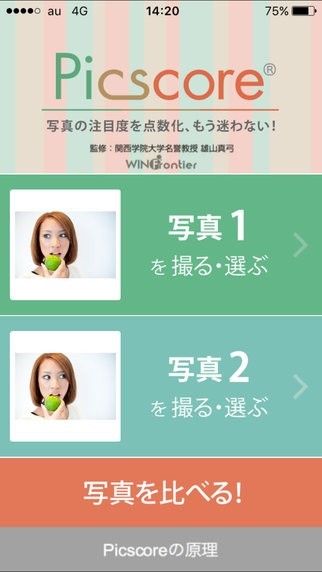 「Picscore」は二枚の写真を比較してどちらが注目度の高い写真なのかを判断してくれる画像比較アプリになります。このアプリは同じような構図、デザインの写真が二枚あってどちらを使うか迷ったときに役立つアプリとなっていて、二つの写真を選択することでアプリがフラクタル解析をもちいて数学的に解析することで注目度を点数化して比較することができるようになっているので、どちらがより良い写真なのかを客観的に判断することが出来ます。