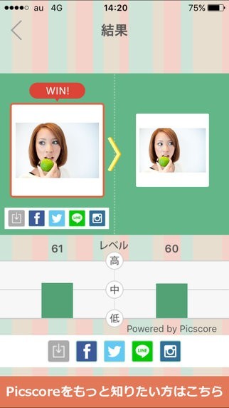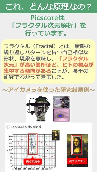 SNSサイトに写真をアップロードしたいけど、どの写真を選べば良いのか分からない時に参考になるのがこのアプリです。 写真を比較する機能が付いており、点数が付けられます。 適当に点数化しているのではなく、フラクタル解析による科学的な点数化を行っています。 なぜこの写真を選んだのか、お友だちに質問された際、フラクタル解析で選ばれたと説明できるようになります。 まずは比較したい写真を2枚選び、ボタンを押し、解析が終わるのを待ちます。 後は点数の高いほうの写真を選んでアップロードするだけ、分かりやすい使い方となっています。 ホームページに使用する写真を選びたい時にも使えます。