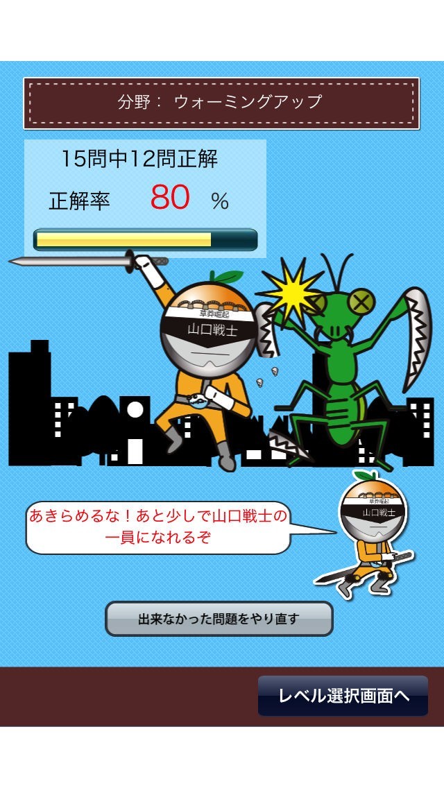 山口県民も知らないかも?というようなマニアックな問題からウォーミング用のオーソドックスな問題まで用意されています。立ち向かってくる5体の怪獣を倒して山口戦士の一員を目指しましょう。