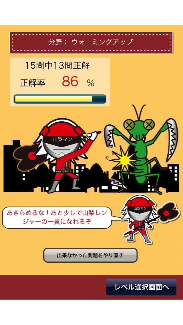 ゲーム中には赤いコスチュームの山梨マンというキャラクターが登場します。彼の使命は怪獣を打ち倒すことです。ユーザーのクイズの結果により、山梨マンは怪獣に勝利したり敗北したりします。