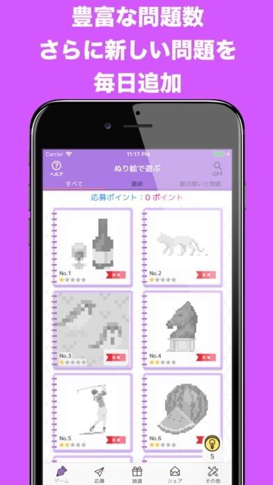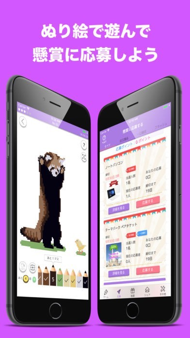 好きな絵柄を選び、色と配置をタッチするだけで綺麗なぬり絵を簡単に仕上げることができます。また、ぬり絵を楽しめば懸賞に応募することができ、素敵な商品を手に入れることができるアプリです。