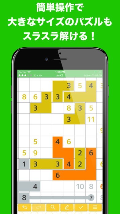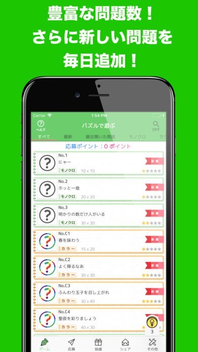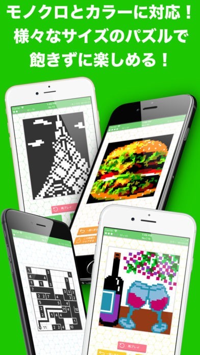 パズルのタイプはカラーとモノクロの2種類。難易度は様々です。日々様々なサイズや難易度のパズルが配信されるので、モチベーションにも繋がります。暇な時間を見つけて楽しみながら賞品をゲットしましょう。
