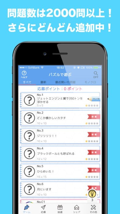 好みの景品の懸賞に応募することが可能です。問題数は1000問以上あり、新作パズルがどんどん追加されていくので飽きることなく楽しめます。たくさん遊んだほうが、懸賞の当選確率が上がります。手早くイラストを完成したいときは、長押ししてまとめ塗りを行うと便利です。