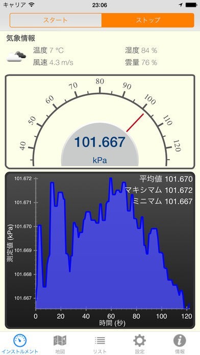 気圧を測定したら時間ごとの変化がグラフ表示されます。気圧の変化がつかみやすくなります。