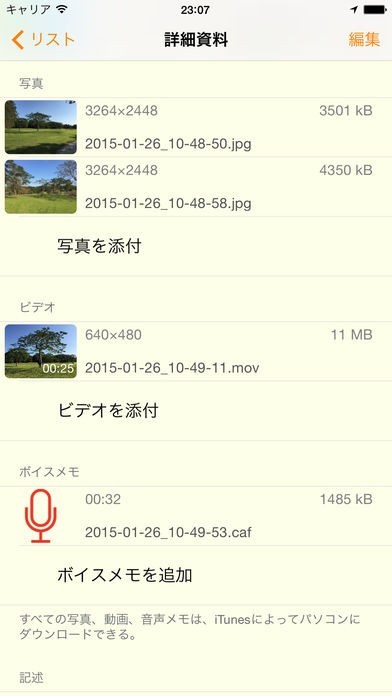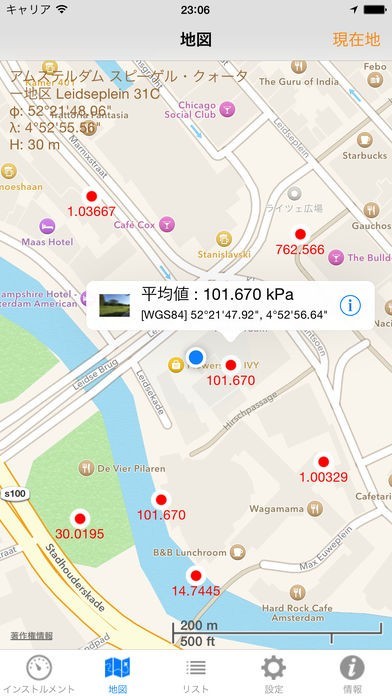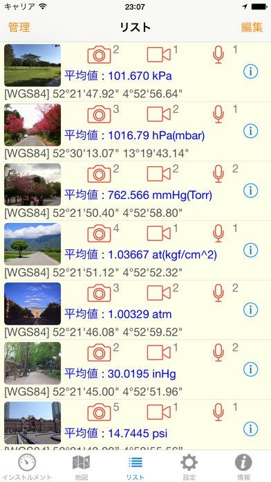 測定した気圧データはマップで場所を指定して、残しておくことができます。他にも写真や動画、ボイスメモなども一緒に添付して記録することができるので分かりやすく便利です。