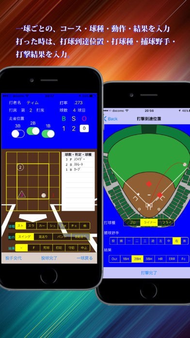 打席での1球1球の結果をアプリに入力して行きます。