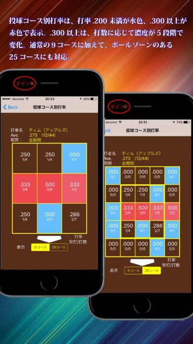 小学生だと、ボールゾーンの球を打つ事もあるので、9分割だけではなく、25分割の表示にも対応しています。