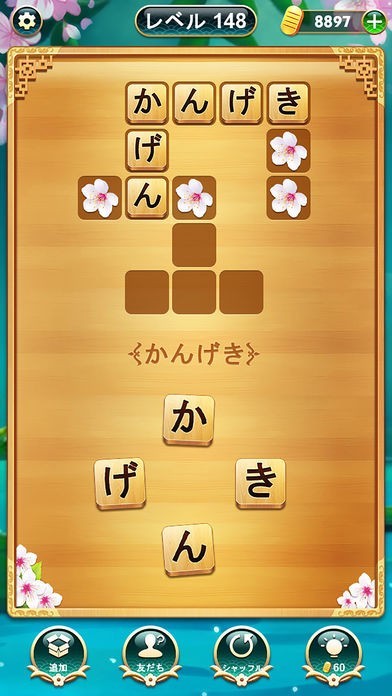 問題は出題系ではなく遊戯風に空欄スペースを埋めていく形がとられています。そのため遊ぶ感覚で平仮名の間にある文字が何か探れます。すべてのマスが入力できると完了状態でスコア加算になります。
