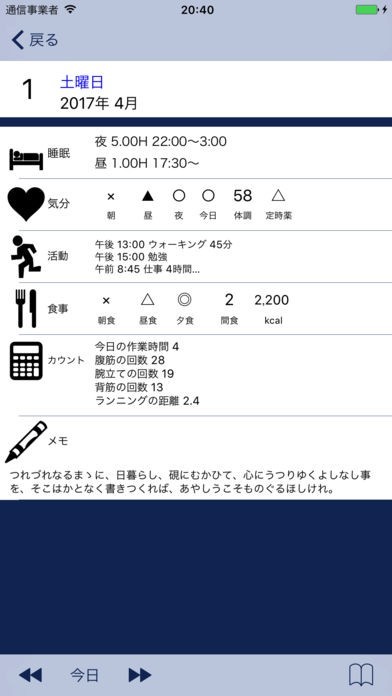良質な睡眠をとることができていなければストレスがたまったり、思うように体が動かないこともあります。そこで、健康状態に関する様々なデータを入力することによって包括的に生活を見直すことができます。