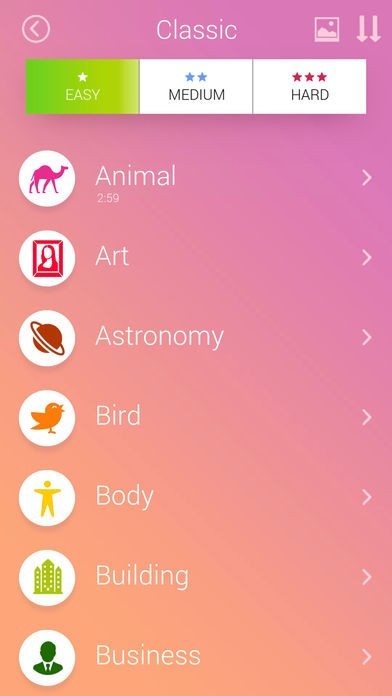 難易度は全部で3段階に分かれています。「動物」、「美術」、「建物」などさまざまなテーマに関連する単語をできるだけ多く発見するという内容で、長い時間楽しむことができます。
