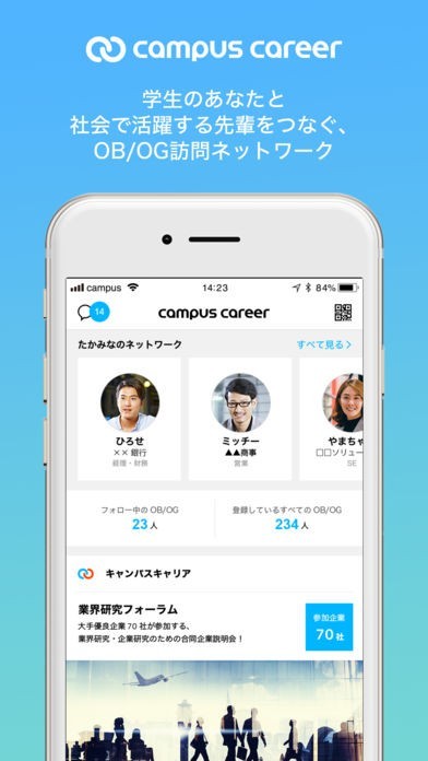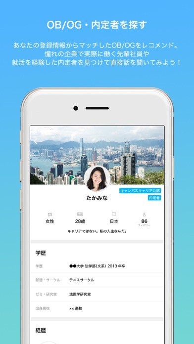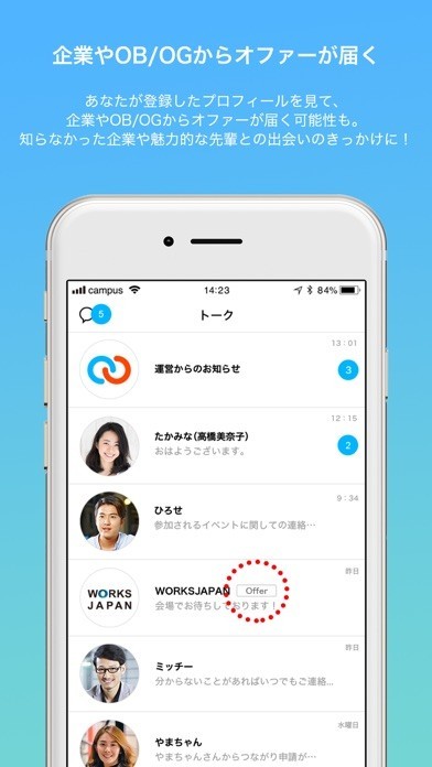 企業に勤めるOBやOGの話しを直接聞くことができ、トーク機能を利用していつでも質問することができたり、企業からの就職活動情報など就職に必要な最新情報を手に入れることができます。