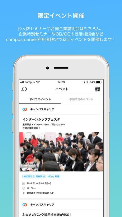 企業がおこなう就職活動イベント情報を得ることができ、さらにイベントの受付もアプリからQRコードを使っておこなうので楽です。いつでもどこでも、アプリさえあれば就職活動やイベント参加が行なえて便利です。