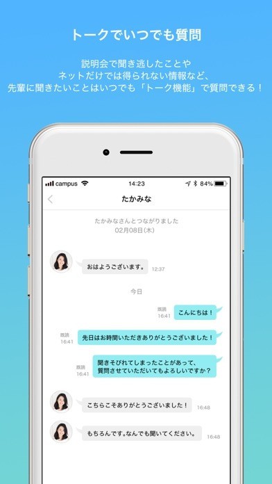 OBやOGの話しを聞けるだけでなくトーク機能で何でも質問できる