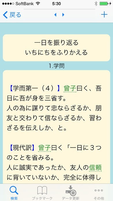 学問・政治・孝行の3種類のジャンルに論語の名句が分類されているので、自分が悩んでいる分野や興味のある分野についての孔子の思想に素早くにたどり着くことができます。