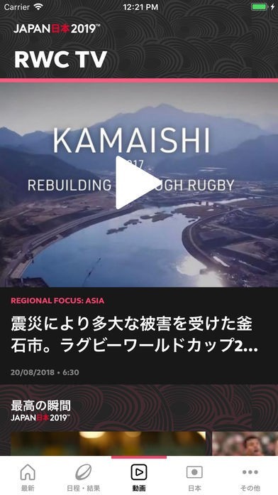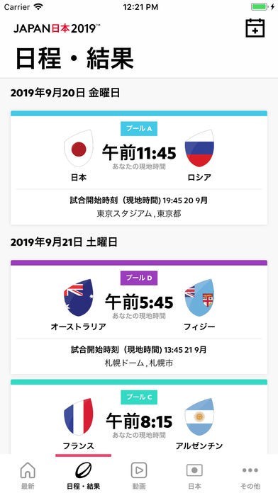 このアプリはラグビーW杯2019の公式アプリです。ラグビーW杯の試合の日程や、キックオフの時刻、またすでに終わった試合の試合結果をリアルタイムで見ることができます。