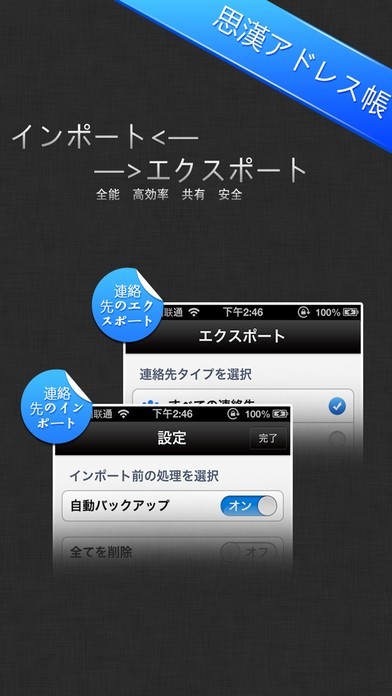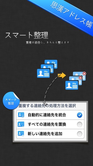 アドレスをバックアップできるこのアプリは、インポート時の動作も軽快です。インポート時にアドレス帳に変更があった場合にも、連絡先の情報をスマートに結合してくれます。