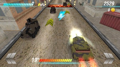 ベスト戦車ラッシュレーシングゲームは戦車同士がスピード競争を繰り広げるランゲームで、戦車とは思えないようなスピードで走り回り、ジャンプ台から飛行までします。五つのレーンがあり左右に切り替えながら敵戦車を追い抜いていくスタイルが基本ですが、レース中に現れる雷のマークを3つ集めると一定時間無敵状態になり、敵戦車をふっ飛ばして進むという爽快感のあるゲームスタイルに変化します。ゲームを続けていくと新しい戦車を買えたり、戦車を強化するといった要素もあります。