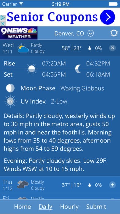 App Storeより引用9News in Denver, Colorado is proud to present a full featured weather app that provides complete Colorado and national weather information anytime. Now you can get the latest weather conditions, severe weather alerts and comprehensive forecast information for Denver, Colorado, and the rest of the nation. Weather information is provided from the most trusted weather team in Colorado. The 9News weather app is free.