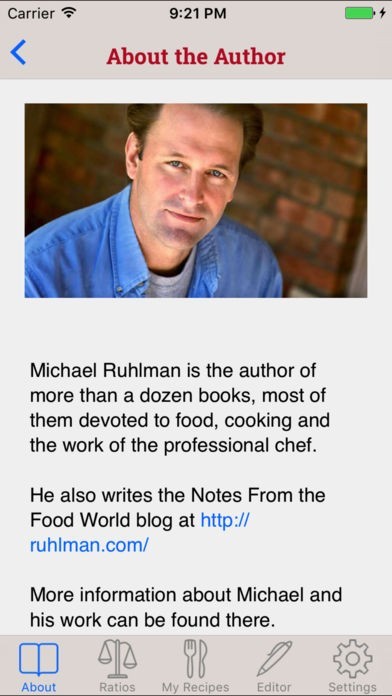 App Storeより引用Free yourself from recipes! The best-selling cookbook, Ratio: The Simple Codes Behind the Craft of Everyday Cooking, by me, Michael Ruhlman, is now an iPhone app that will help you calculate amounts of ingredients in all the fundamental culinary preparations. When you know a ratio, you don’t know a recipe, you know 1,000. And this application does all the calculating for you.